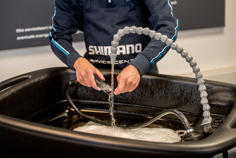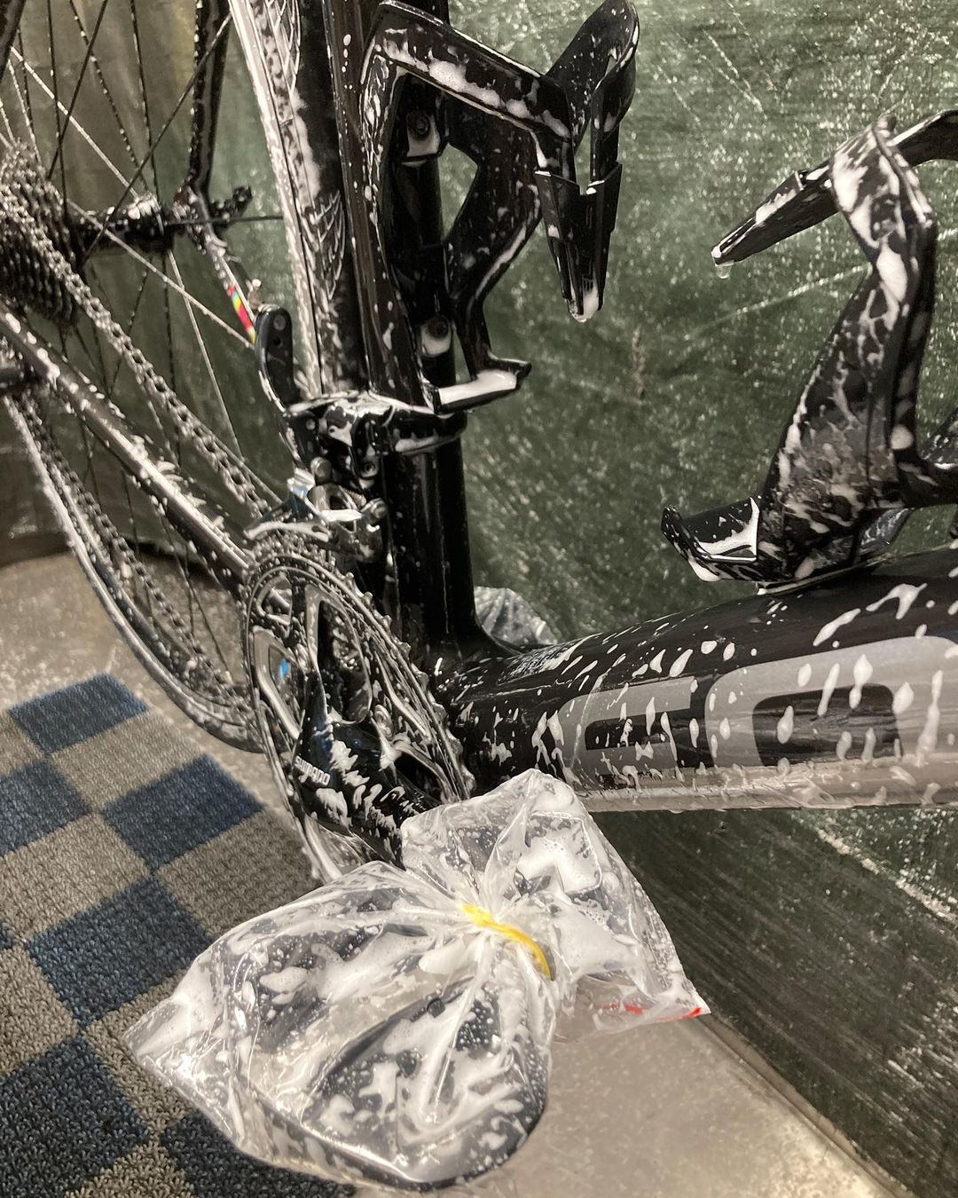 Pesemme pyörät käsin harjalla ja sienellä. Käytämme mäntyöljypohjaista pesuainetta ja voimansiirron osissa tarvittaessa liuotinpesuainetta.